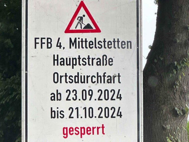 in der Zeit vom 23.09.2024 bis 21.10.2024 wird die Hauptstraße (FFB 4) in Mittelstetten ab der Muthilostraße bis Ortsende nach Tegernbach vollständig gesperrt (von km 3,0 bis 4,2).